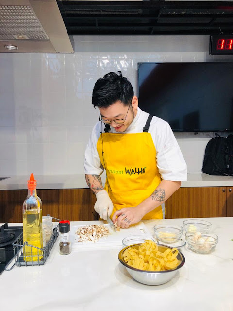 Beranjak ke acara berikutnya, para peserta diajak untuk memasak olahan pangan dari hutan bersama jebolan Master Chef Indonesia Season 3 William Gozali. Pria kelahiran tahun 1991 ini, selain piawai dalam mengolah masakan, ia juga seorang pribadi yang asik dan ramah. Tak jarang gelak tawa terdengar saat cooking demo berlangsung. Para peserta dibagi menjadi 5 (lima) kelompok yang terdiri dari 6 (enam) orang peserta. Tema memasakpun tak lepas dari olahan pangan dari hutan, kali ini bahan yang menjadi primadona olahan dari hutan adalah jamur. Jamur yang digunakan dalam cooking demo yaitu jenis jamur shiitake. Ssstt, ada yang tahu ngga kalau jenis jamur ini salah satu manfaatnya sebagai skincare lho! Kojic acid di dalamnya merupakan alternatif pengganti hydroquinone sehingga bermanfaat untuk menyamarkan noda hitam pada wajah, wow banget kan! Selain itu, shiitake juga mengandung vitamin D yang bagus untuk mengatasi infalamasi atau peradangan kulit. Nah, makin cinta kan dengan olahan pangan dari hutan. Untuk membuat Fettucine Mushroom Ragu yang nikmat, selain jamur shiitake bahan lainnya terdiri dari pasta kering, daun bawang, daun kucai, bawang putih, butter, keju tabur, cream, dan minyak goreng.