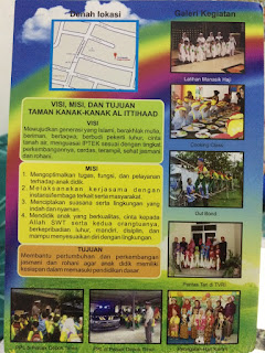 - Tentukan pilihan apakah anak mau disekolahkan di TK Islam (bagi yang beragam Islam atau TK Umum bagi anak-anak yang ingin di sekolahkan dengan berbagai macam latar agama bisa di sekolahkan di TK Umum). Pertimbangan saya memilih TK Islam karena saya menyadari bahwa sebagai ibu yang juga bekerja di luar rumah, saya ingin anak saya mendapatkan lebih dari apa yang bisa saya ajarkan di rumah, saya hanya khawatir kalau yang saya ajarkan di rumah kurang maksimal, meskipun alhamdulillah anak saya memiliki perkembangan yang baik meskipun saya tinggal bekerja. Selain itu, bagi saya kalau Sang TK Islam maka Sang akan lebih banyak waktu belajar tentang sholat berjamaah dan belajar tentang agama bersama temannya, sehingga efek ke anak akan lebih baik dan lebih terlihat, karena hablum minannas-nya juga terjalin kuat, insyaAlloh.